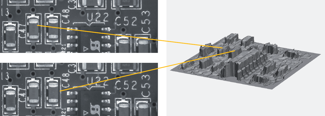 Our software supports stereo vision by calculating the 3D coordinates on the object surface. For a stationary object, this can be done with the aid of a two camera setup (binocular) or multiple cameras (multi-view). Using only one camera, the 3D object shape can be computed from the relative motion between camera and object. Stereo vision is realized either by calculating dense 3D coordinates or distance images, or by determining the coordinates for specific points or edges – especially suitable for highly accurate height measuring. Furthermore, our software offers multigrid stereo – an advanced method to interpolate the 3D data in homogeneous image parts. This method yields higher accuracy for small objects.