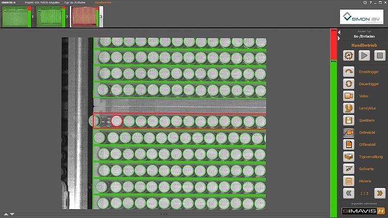 Goldfuß engineering GmbH was commissioned by a global producer of active pharmaceutical ingredients to develop a new robot cell for the automated loading and unloading of the trolleys. SIMON IBV GmbH was responsible for developing the optical 3D system that enables the robot to grip the vials independently without damaging them. Such an automation solution was previously not available on the market. In comparable applications, the vials are loaded manually into trays or boxes after filling, manually stacked on pallets or in Kanban trolleys, and subsequently depalletized again.