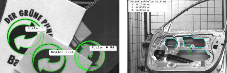 Die subpixelgenaue formbasierte Matching-Technologie findet Objekte präzise und robust in Echtzeit. Dies funktioniert sogar wenn sie rotiert, skaliert, perspektivisch verzerrt, lokal deformiert, teilweise überdeckt bzw. außerhalb des Bildes sind oder nicht-linearen Beleuchtungsschwankungen unterliegen. Das formbasierte Matching verarbeitet Bilder mit 8- oder 16-Bit sowie Farb- und Mehrkanalbilder. Objekte können anhand von Bildvorlagen oder CAD-Daten trainiert werden. Darüber hinaus lokalisiert das einzigartige komponentenbasierte Matching Objekte, die aus mehreren gegeneinander beweglichen Teilen bestehen. In den folgenden drei Tutorial-Videos erfahren Sie, wie Sie mit unserer Software verschiedene Anwendungen für formbasiertes Matching erstellen können: